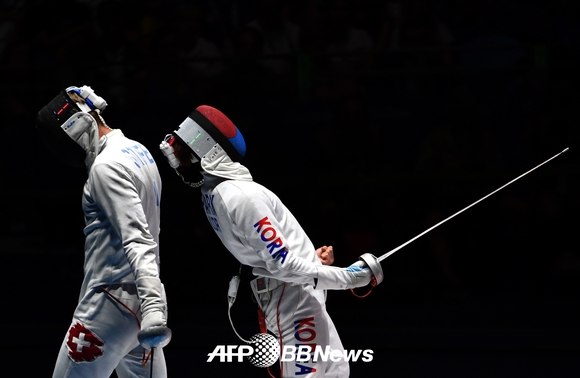 펜싱 국가대표 박상영이 10일(한국시각) 브라질 리우 카리오카 아레나에서 열린 '2016 리우데자네이루 올림픽' 펜싱 남자 개인 에페 결승전에서 헝가리의 제자 임레를 꺾고 금메달을 목에 걸었다.