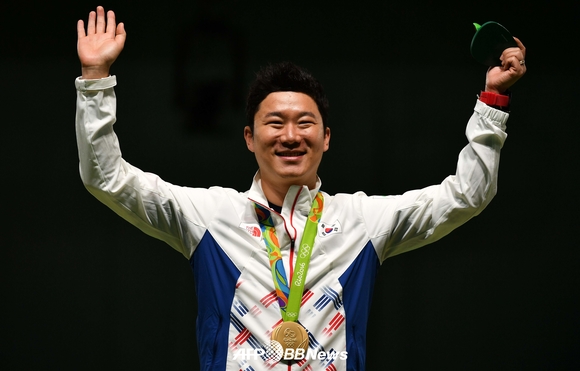 진종오는 올림픽 신기록인 193.7점을 쏘며 2008 베이징 올림픽, 2012 런던 올림픽에 이어 올림픽 3연패의 금자탑을 쌓았다.ⓒAFPBBNews = News1
