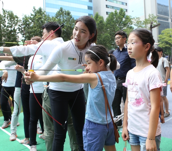 현대백화점은 브라질 국제 스포츠 대회 양궁 개인 결승전을 앞둔 11일 강남구 상성동에 취지한 무역센터점 정문 광장에서 '양궁 꿈나무 후원을 위한 금메달리스트 스페셜 매치'를 진행했다.