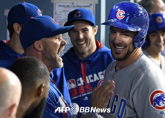 "나 좀 잘했쪙?" 홈런 뒤 축하받는 미 프로야구 시카고컵스 훈남 타자