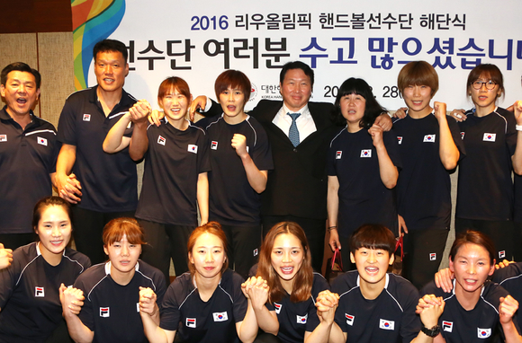 [쿠키뉴스=구현화 기자] 대한핸드볼협회장인 최태원 SK그룹 회장이 28일 저녁 서울 광장동 워커힐호텔에서 열린 리우올림픽 핸드볼 선수단 해단식에 참석, 최선을 다해준 핸드볼 선수단과 핸드볼협회 관계자들을 격려한 뒤 단체 사진 촬영을 하고 있다.