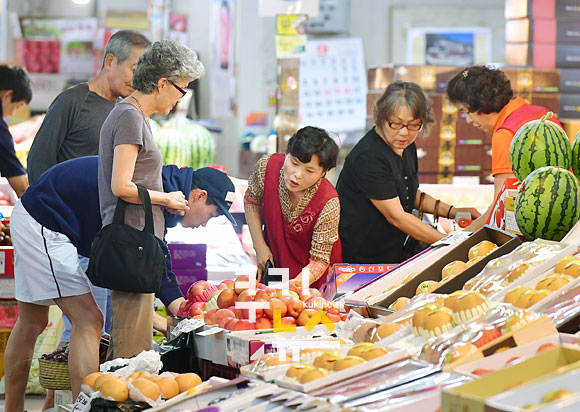 [쿠키뉴스=박효상 기자] 추석을 사흘 앞둔 12일 서울 마포구 마포농수산물시장을 찾은 한 가족이 차례상에 올릴 과일을 고르고 있다. tina@kukinews.com