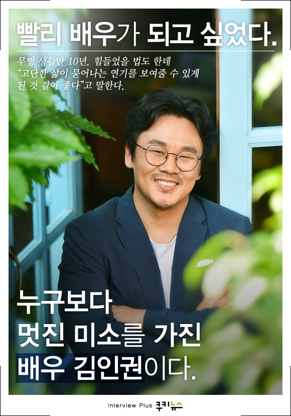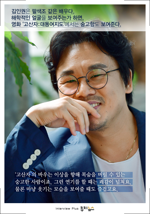 김인권은 팔색조 같은 배우다. 해학적인 얼굴을 보여주는가 하면, 영화 ‘고산자 : 대동여지도’에서는 숭고함도 보여준다. “‘고산자’의 바우는 이상을 향해 목숨을 버릴 수 있는 숭고한 사람이죠. 그런 연기를 할 때는 쾌감이 넘쳐요. 물론 마냥 웃기는 모습을 보여줄 때도 즐겁고요.”