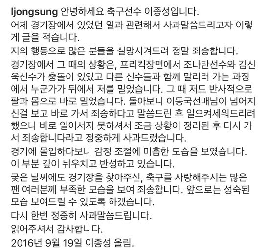 결국 이종성은 19일 오후 자신의 SNS 계정을 통해 사과문을 게재했다. 그는 "프리킥 상황에서 조나탄 선수와 김신욱 선수의 충돌이 있었고 다른 선수들과 말리러 가는 도중 누군가 뒤에서 저를 밀었다"며 "반사적으로 팔과 몸으로 바로 밀었는데 돌아보니 이동국 선배님이 넘어지신 걸 봤다"고 당시를 설명했다.