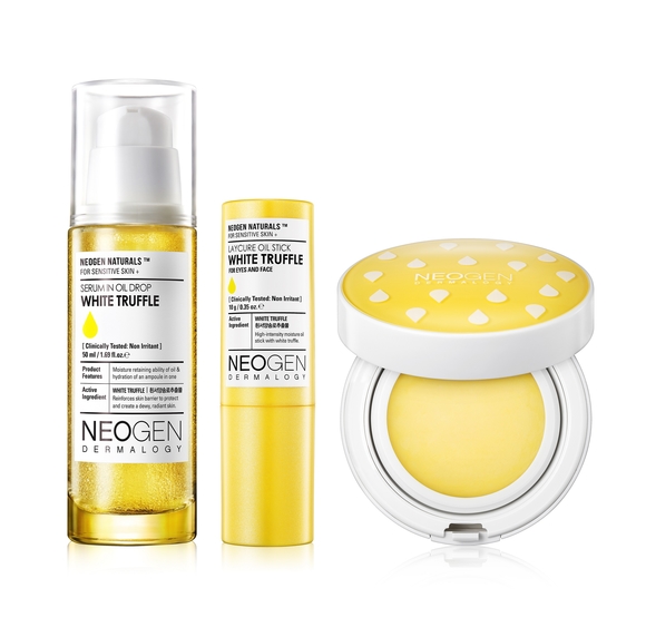 이번에 선보이는 네오젠 더마로지 화이트 트러플 라인은 총 3종(오일 세럼, 오일 스틱, 오일 팩트)으로 구성돼 있다. 3종에는 모두 ‘땅속의 다이아몬드’라 불리는 화이트 트러플(흰 송로버섯) 추출물이 함유돼 눈길을 끈다.