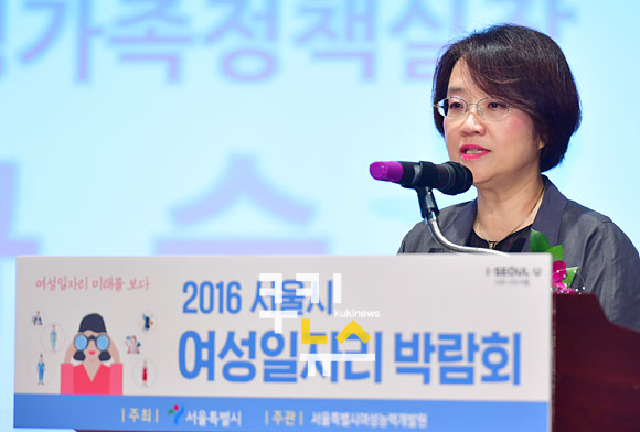 [쿠키뉴스=박효상 기자] 임규숙 서울특별시 여성가족정책실장이 27일 오후 서울 여의도 중소기업중앙회 그랜드홀에서 열린 ‘2016 서울시 여성 일자리박람회’에서 환영사를 발표하고 있다.