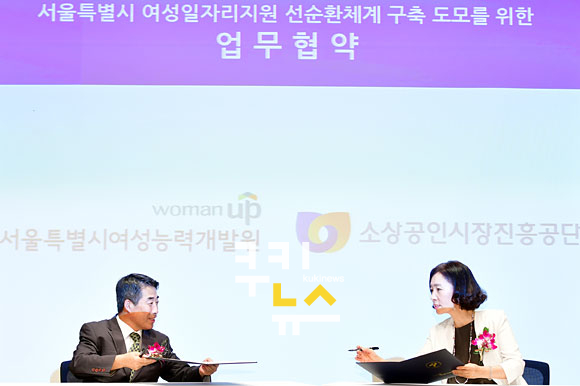 [쿠키뉴스=박효상 기자] 맹철영 소상공인시장진흥공단 본부장과 서미경 서울특별시여성능력개발원 서미경 원장이 27일 오후 서울 여의도 중소기업중앙회 그랜드홀에서 열린 ‘2016 서울시 여성 일자리박람회’에서 맞춤형 일자리 제공을 위한 MOU를 체결하고 있다.