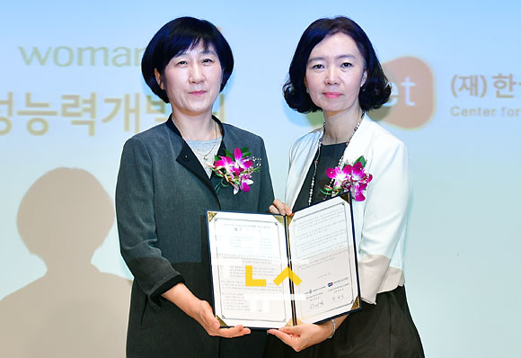 [쿠키뉴스=박효상 기자] 한화진 한국여성과학기술인지원센터 소장과 서미경 서울특별시여성능력개발원 서미경 원장이 27일 오후 서울 여의도 중소기업중앙회 그랜드홀에서 열린 ‘2016 서울시 여성 일자리박람회’에서 맞춤형 일자리 제공을 위한 MOU를 체결하고 있다.