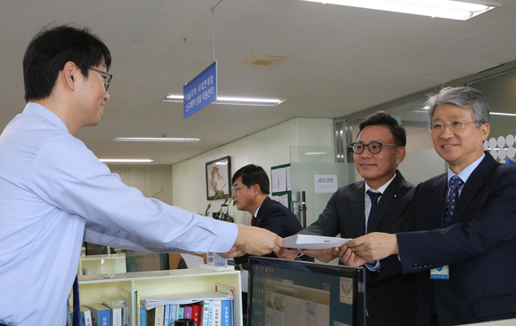 [쿠키뉴스=구현화 기자] HDC신라면세점의 양창훈 대표와 이길한 대표가 4일 서울 시내 면세점 신규 특허를 얻기 위한 사업 계획서를 직접 관세청에 제출했다.