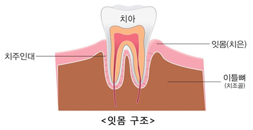 [쿠키뉴스=송병기 기자] 좁은 의미의 잇몸은 치은이라 부르는 곳으로 치아의 목 부분에서부터 치아의 뿌리 방향으로 치조골(치아의 뿌리가 박혀 있는 턱뼈의 치아 쪽 일부분)을 덮고 있는 분홍색 점막조직을 말한다.