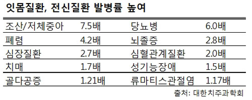 혈관질환이 생기는 것도 비슷하다. 잇몸질환으로 일어난 면역반응에 의해 염증물질이 생기고, 이 물질이 혈관을 타고 다니다 혈전에 붙어 혈전을 더욱 키운다. 뇌졸중, 심혈관질환, 심장병이 악화하는 기전이다. 잇몸질환은 이런 과정을 통해 이들 질환 발생 위험을 각각 2.8배, 2배, 2.7배 높이는 것으로 보고돼 있다.
