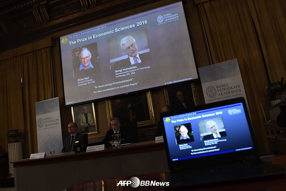 올해 노벨경제학상은 올리버 하트(영국) 하버드대 교수와 벵트 홀름스트룀(핀란드) 매사추세츠공과대학(MIT) 교수에게 돌아갔다. 스웨덴 왕립과학원 노벨위원회는 10일(현지시간) 기자회견을 열고 하트 교수와 홀름스트룀 교수를 2016년 노벨경제학상 수상자로 선정했다고 밝혔다.