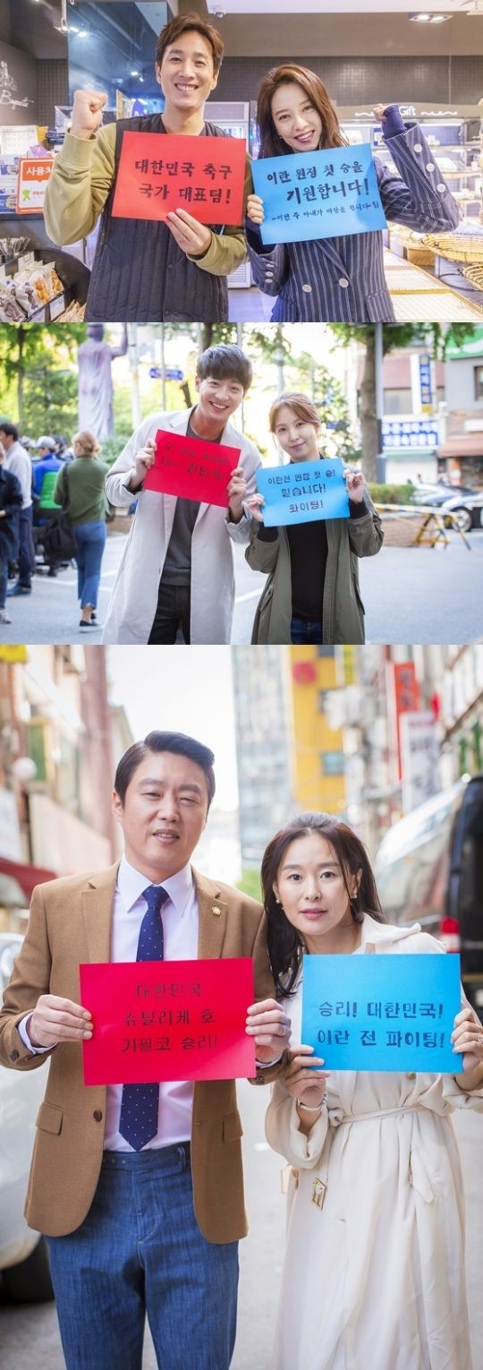 11일 JTBC ‘이번 주 아내가 바람을 핍니다’의 주연 이선균-송지효, 김희원-예지원, 이상엽-보아가 이란 원정 첫 승을 기원하는 메시지를 공개했다. 이번 경기는 한국시간으로 이날 오후 11시30분 테헤란 아자디 스타디움에서 펼쳐진다.