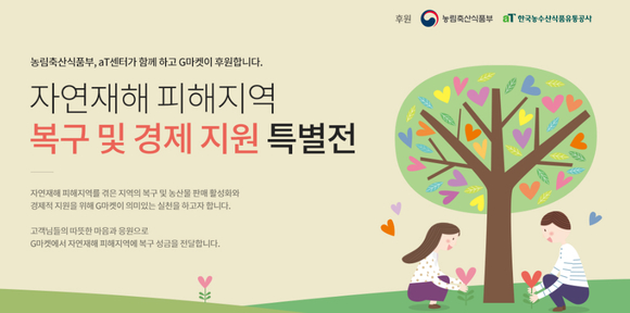 [쿠키뉴스=구현화 기자] 국내 최대 온라인쇼핑몰 G마켓과 옥션, G9를 운영하는 이베이코리아가 농림축산식품부, aT유통공사와 함께 자연재해 피해지역 농산물 판매 활성화를 위한 기획전을 진행한다.