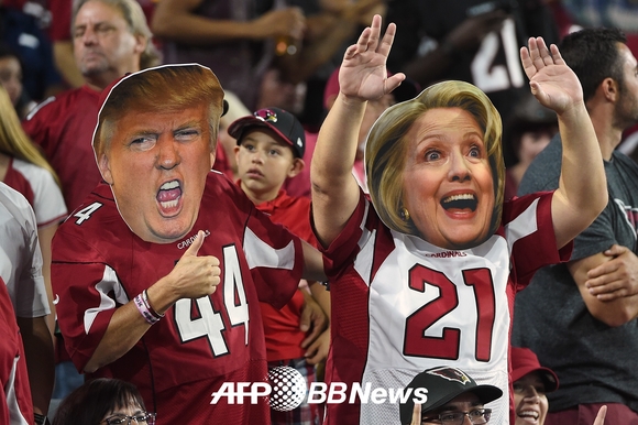 이날 경기장을 찾은 팬들이 미국 대선 후보 도날드 트럼프와 힐러리 클린턴의 가면을 쓰고 응원하고 있다. ⓒAFP BBNews = News1 tina@kukinews.com