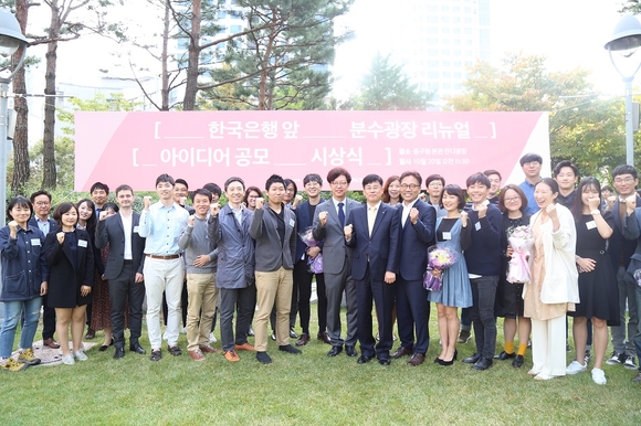 [쿠키뉴스=구현화 기자] 신세계와 중구청이 함께 진행하는 ‘한국은행 앞 분수광장 리뉴얼 아이디어 공모’ 시상식을 중구청에서 진행했다고 20일 밝혔다.
