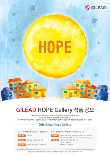 [쿠키뉴스=송병기 기자] 길리어드 사이언스 코리아(대표이사 이승우)는 이달 24일부터 다음달 16일까지 ‘제4회 희망갤러리’에 참여할 일반인 작품 공모를 진행한다.