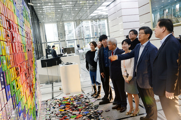 LG전자는 25일 오전 여의도 LG트윈타워에서 폐휴대폰을 활용한 예술작품 공개행사를 개최했다. 이날 행사에는 LG전자 이충학 부사장, 한국 예술인복지재단 박계배 대표이사 등이 참석했다.