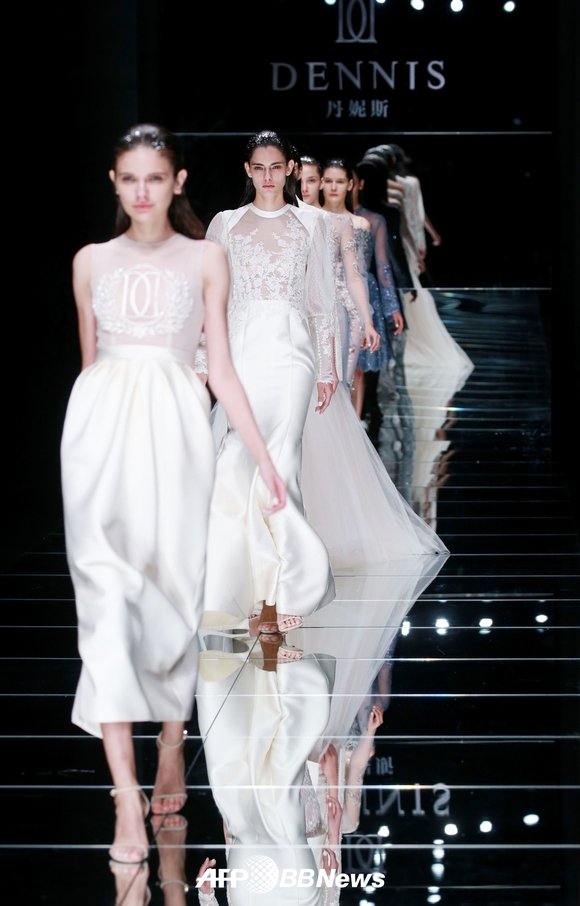 [쿠키뉴스=박효상 기자] 모델들이 31일(현지시각) 중국 베이징에서 열린 패션위크 디자이너 후앙부얀의 패션쇼에서 런웨이를 걷고 있다.ⓒAFP BBNews = News1 tina@kukinews.com