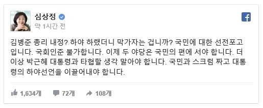 심 대표는 이날 자신의 SNS를 통해 “김병준 총리 내정, 하야 하랬더니 막가자는 건가”라며 “이는 국민에 대한 선전포고”라고 말했다.