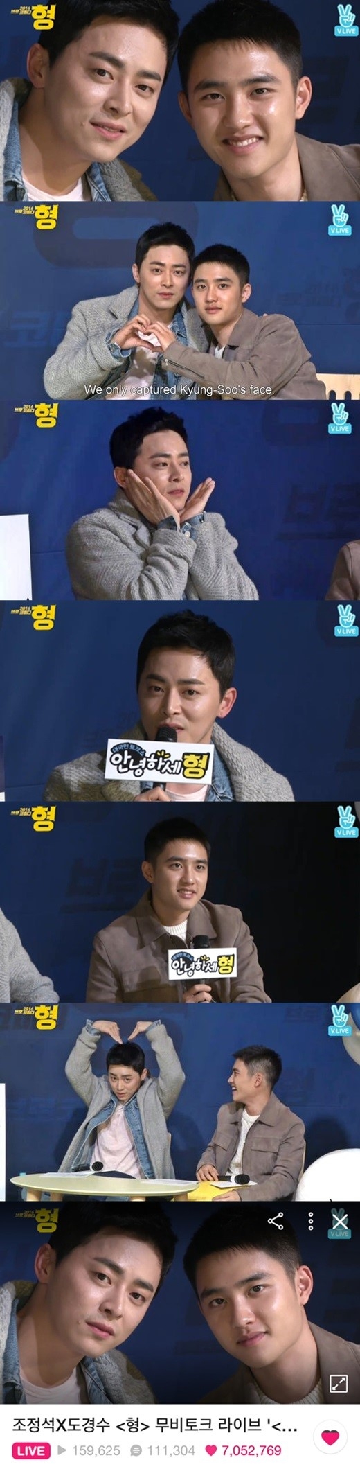 영화 '형'이 포털사이트 네이버 V앱의 기록을 경신했다. 지난 3일 오후 진행된 네이버 V앱 무비토크 라이브에서 '형'의 주역인 조정석과 도경수(엑소 디오)는 '안녕하세형'이라는 타이틀로 100명의 대한민국 형제자매, 그리고 남매 100여 명의 고민을 듣는 시간을 가졌다.