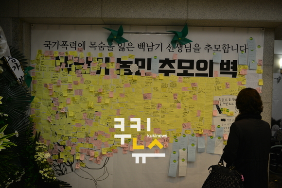 [쿠키뉴스=민수미 기자] 고(故) 백남기 농민의 발인식이 5일 오전 8시 서울 종로구 혜화동 서울대병원 장례식장에서 치러졌다. 유가족은 이날 정식 장례절차를 밟고 ‘생명과 평화의 일꾼 고 백남기 농민 민주사회장’을 진행한다고 밝혔다. 백씨의 시신은 오는 6일 광주광역시 망월동 광주 5·18 구묘역에 묻힐 예정이다.