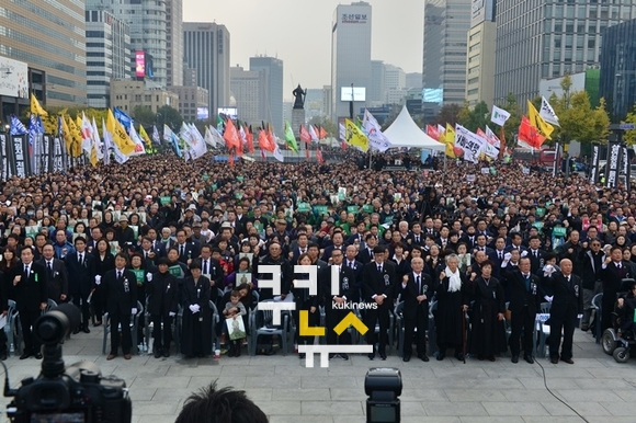 앞서 주최측은 오후 5시부터 광화문우체국에서 종로2가, 안국로터리, 종로1가 등을 거쳐 교보문고까지 또 종로3가, 을지로3가, 시청, 대한문을 통해 일민미술관까지 각각 2만명이 전 차로를 행진하겠다고 신고했다.