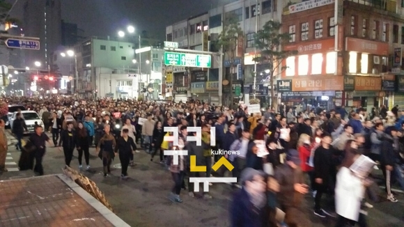 현재 시민들은 촛불을 들고 종로1가 방향으로 행진하고 있다.
