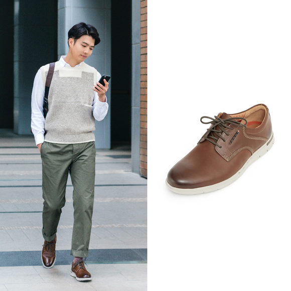 ◇ 따뜻한 낮에는 니트 베스트, 카키색 팬츠, 브라운 캐쥬얼 슈즈로 젊은 분위기 연출