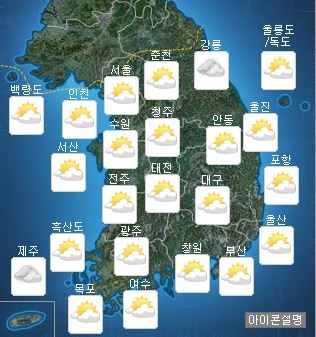 아침 기온은 서울 5도, 춘천 2도, 대전 4도, 광주 8도, 부산 12도, 제주 14도 등이고 낮 최고 기온은 서울 15도, 춘천 14도, 대전 16도, 광주 17도, 부산 18도, 제주 18도 등이다.