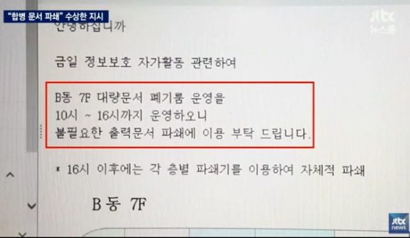 보도에 따르면 삼성물산은 이날 직원들에게 "금일 정보보호 자가활동 관련해 대량문서 폐기룸 운영을 한다"며 직원들에게 제일모직 합병과 관련한 문서를 파기하라고 구두로 지시했다. 또 파기 후 지시사항을 이행했는지 서명까지 하도록 가이드라인을 제시했다.