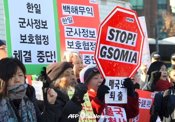 [쿠키뉴스=구현화 기자] 한국과 일본 사이에 맺은 한일 군사정보 보호협정에 항의하는 시위대가 23일 서울 국방부 앞에서 시위를 벌이고 있다.