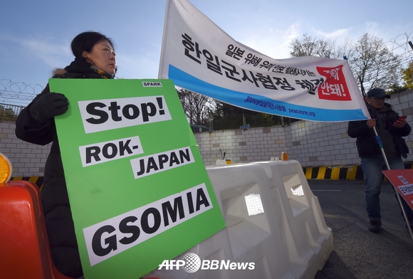[쿠키뉴스=구현화 기자] 한국과 일본 사이에 맺어진 한일 군사정보 보호협정에 항의하는 시위대가 23일 국방부 앞에서 시위를 벌이고 있다.