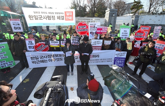 [쿠키뉴스=구현화 기자] 한국과 일본 사이에 맺어진 한일 군사정보 보호협정에 항의하는 시위대가 23일 국방부 앞에서 시위를 벌이고 있다.