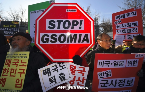 [쿠키뉴스=구현화 기자] 한국과 일본 사이에 맺어진 한일 군사정보 보호협정에 항의하는 시위대가 23일 국방부 앞에서 시위를 벌이고 있다.