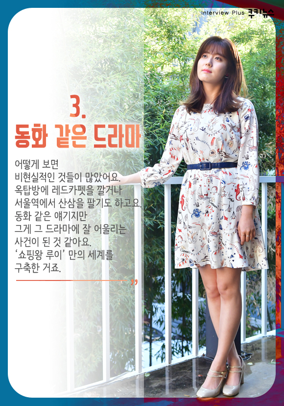 “어떻게 보면 비현실적인 것들이 많았어요. 옥탑방에 레드카펫을 깔거나 서울역에서 산삼을 팔기도 하고요. 동화 같은 얘기지만 그게 그 드라마에 잘 어울리는 사건이 된 것 같아요. ‘쇼핑왕 루이’ 만의 세계를 구축한 거죠.”