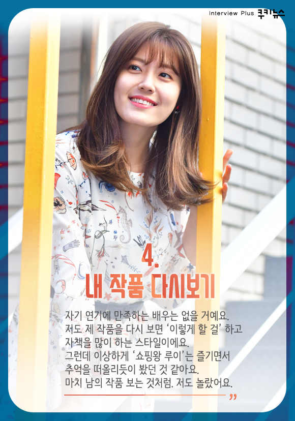 “자기 연기에 만족하는 배우는 없을 거예요. 저도 제 작품을 다시 보면 ‘이렇게 할 걸’ 하고 자책을 많이 하는 스타일이에요. 그런데 이상하게 ‘쇼핑왕 루이’는 즐기면서 추억을 떠올리듯이 봤던 것 같아요. 마치 남의 작품 보는 것처럼. 저도 놀랐어요.”