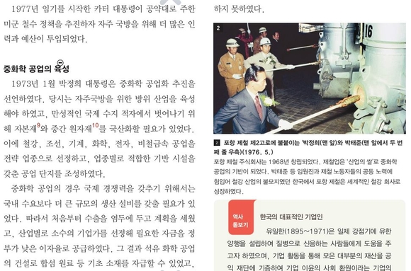 기존 검정교과서(미래엔출판사)에서는 고 박 전 대통령에 대한 서술이 6페이지였던 것에 반해, 국정교과서에서는 총 9페이지로 늘었다. 심지어 전체 교과서의 분량이 20%가량 줄었음에도 고 박 전 대통령 서술 분량은 오히려 늘어났다. 고 박 전 대통령의 공적 중 하나인 새마을운동 관련 기술도 크게 증가했다. 과거 교과서에서는 간략하게 설명되던 부분이었다.