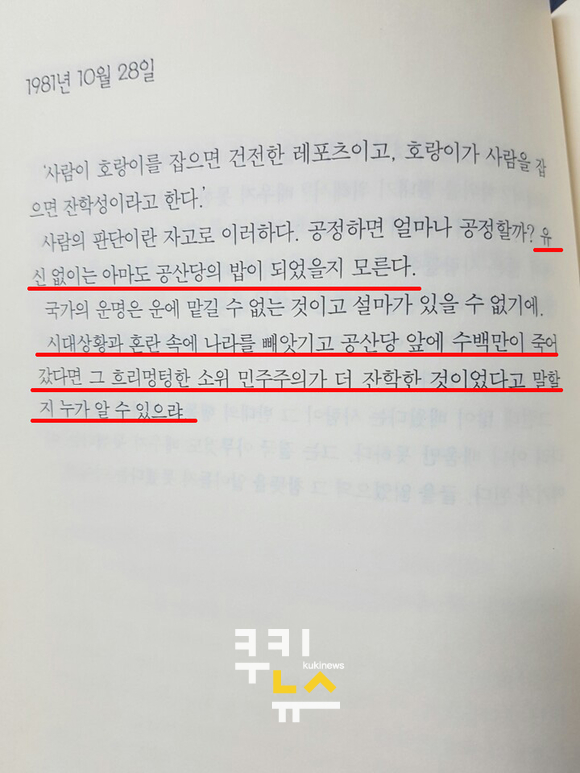 1981년 10월28일. ‘사람이 호랑이를 잡으면 건전한 레포츠이고, 호랑이가 사람을 잡으면 잔학성이라고 한다.’ 사람의 판단이란 자고로 이러하다. 공정하면 얼마나 공정할까? 유신 없이는 아마도 공산당의 밥이 되었을지 모른다. 국가의 운명은 운에 맡길 수 없는 것이고 설마가 있을 수 없기에. 시대 상황과 혼란 속에 나라를 빼앗기고 공산당 앞에 수백만이 죽어갔다면 그 흐리멍텅한 소위 민주주의가 더 잔학한 것이었다고 말할지 누가 알 수 있으랴.