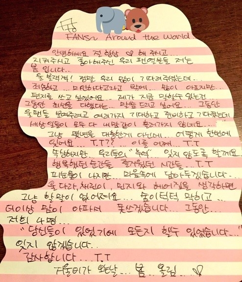 이외에도 박봄은 2NE1의 팬들에게 "그동안 저희 4명은 당신들이 있었기에 뭐든지 할 수 있었다"라며 "잊지 않겠습니다. 감사합니다"라고 전했다.