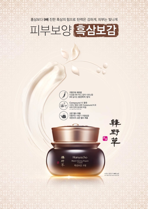 한야초 브랜드에서 가장 먼저 선보이는 흑삼보감 라인은 ‘흑삼’ 성분에 주목했다. 흑삼이란 인삼을 구증구포법을 통해 아홉 번 찌고 아홉 번 말려 얻은 약재로 유효 성분의 효과가 인삼에 비해 더 높은 것으로 알려져 있다. 이런 전통적인 방법으로 얻어낸 흑삼은 피부 탄력과 항산화 효과에 탁월한 사포닌 성분이 농축되어 있어 항산화에 도움을 준다.
