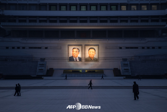 [쿠키뉴스=구현화 기자] 평양의 행인들이 1일 북한 지도자 김일성(사진 왼쪽)과김정일(사진 오른쪽)의 초상화 앞을 지나가고 있다. UN 안전보장이사회는 핵실험을 계속하는 북한에 대해 가장 높은 수준의 제재를 도입했다.