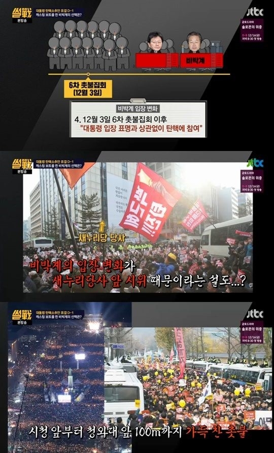 8일 방송된 JTBC ‘썰전’에 출연한 유시민은 대통령 탄핵소추안과 비박계와 친박계 움직임에 대해 이야기했다. 이날 유시민은 “5차 집회와 달리 6차가 강렬했다”며 “사회자 요청에 따라 함성을 지르는 정도가 다르다고 하더라. 청와대 관계자 말로는 땅이 흔들리는 느낌이라더라”고 정치계 인사들의 말을 전했다.