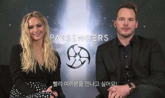 9일 소니 픽쳐스 코리아 공식 페이스북을 통해 공개된 영상에서 제니퍼 로렌스는 “안녕하세요. 한국 팬 여러분”이라고 인사를 건넸다. 크리스 프랫은 “신작 ‘패신저스’로 한국을 방문한다. 빨리 만나고 싶다”고 말했다.