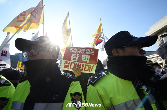 [쿠키뉴스=박효상 기자] 박 대통령 지지자들이 9일 국회 앞에서 시위를 벌이고 있다. ⓒAFP BBNews = News1tina@kukinews.com