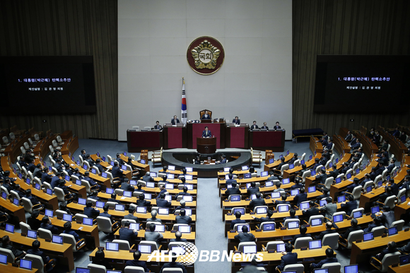 박근혜 대통령에 대한 탄핵소추안이 9일 국회 본회의를 통과했다. 더불어민주당, 국민의당, 정의당 등 171명의 의원이 공동발의해 본회의에 보고됐던 탄핵안은 이날 오후 국회에서 재적의원 300명 가운데 299명이 투표해 찬성 234명, 반대 56명, 기권 7명으로 가결됐다. 표결에 불참한 의원은 대표적인 친박계 새누리당 최경환 의원이다. ⓒAFP BBNews=News1