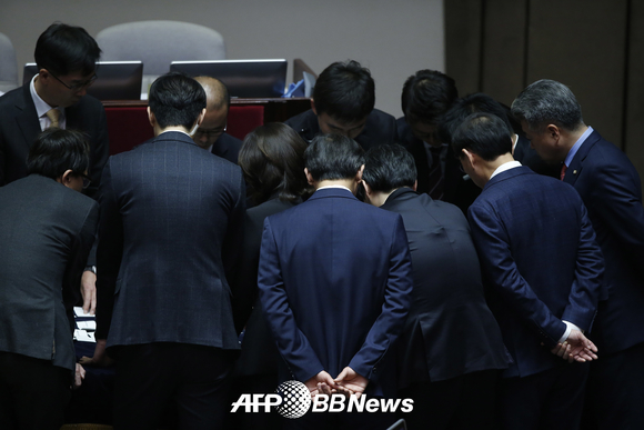 박근혜 대통령에 대한 탄핵소추안이 9일 국회 본회의를 통과했다. 더불어민주당, 국민의당, 정의당 등 171명의 의원이 공동발의해 본회의에 보고됐던 탄핵안은 이날 오후 국회에서 재적의원 300명 가운데 299명이 투표해 찬성 234명, 반대 56명, 기권 7명으로 가결됐다. 표결에 불참한 의원은 대표적인 친박계 새누리당 최경환 의원이다. ⓒAFP BBNews=News1