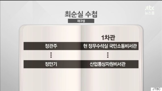JTBC 뉴스룸은 19일 "박영수 특검이 최순실의 인사개입 정황이 적힌 최순실의 수첩을 최순실의 거주지에서 입수했다"고 단독보도했다. 보도에 따르면 수첩에는 정관주 문화체육관광부 1차관과 정만기 산업통상부 1차관의 이름이 적혀있었으며, 정관주 차관 옆에는 현 정무수석실 국민소통비서관이라는 문구가, 그 위에는 ‘1차관’이라는 단어가 적혀있었다.