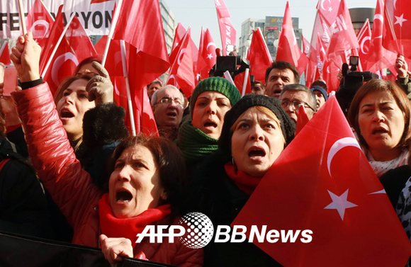 [쿠키뉴스=이은지 기자] 19일(현지시간) 앙카라에서 터키 여인들이 국기를 흔들며 시위 중이다.