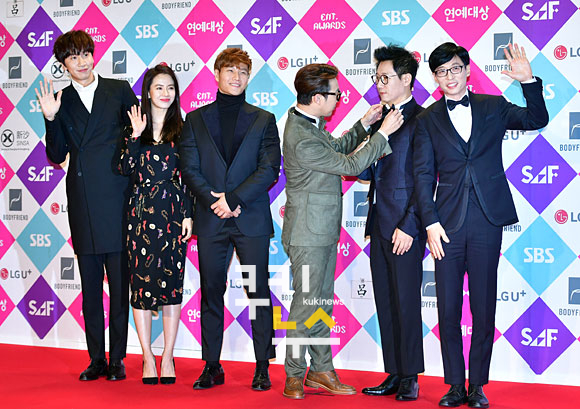 [쿠키뉴스=박효상 기자] '런닝맨' 멤버 이광수와 송지효, 김종국, 하하, 지석진, 유재석이 26일 오후 서울 상암동 SBS 프리즘타워에서 열린 ‘2016 SAF 연예대상’에 참석해 포토타임을 갖고 있다. tina@kukinews.com